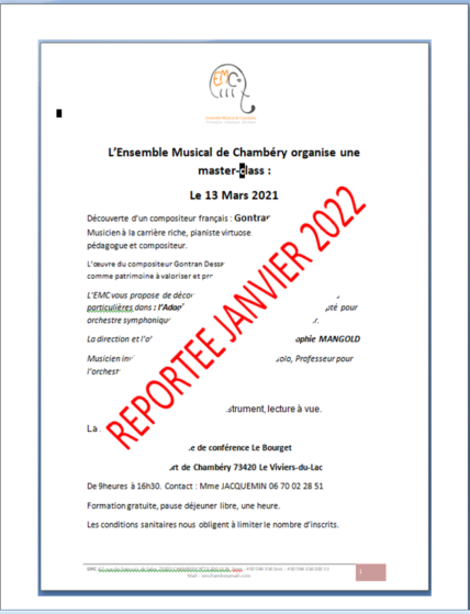 L’ensemble Musical de Chambéry a reçu Marybel DESSAGNES pour une master-class autour de l’œuvre de son père Gontran DESSAGNES. Elle nous propose la réécriture de l’Adagio pour Alto et orchestre pour notre formation et une création nationale en juin 2022 au théâtre Charles Dullin de Chambéry sous sa direction. En effet cette œuvre initialement écrite pour quatuor d’orchestre et alto solo en 1948 fût jouée et diffusée sur les ondes en Algérie.