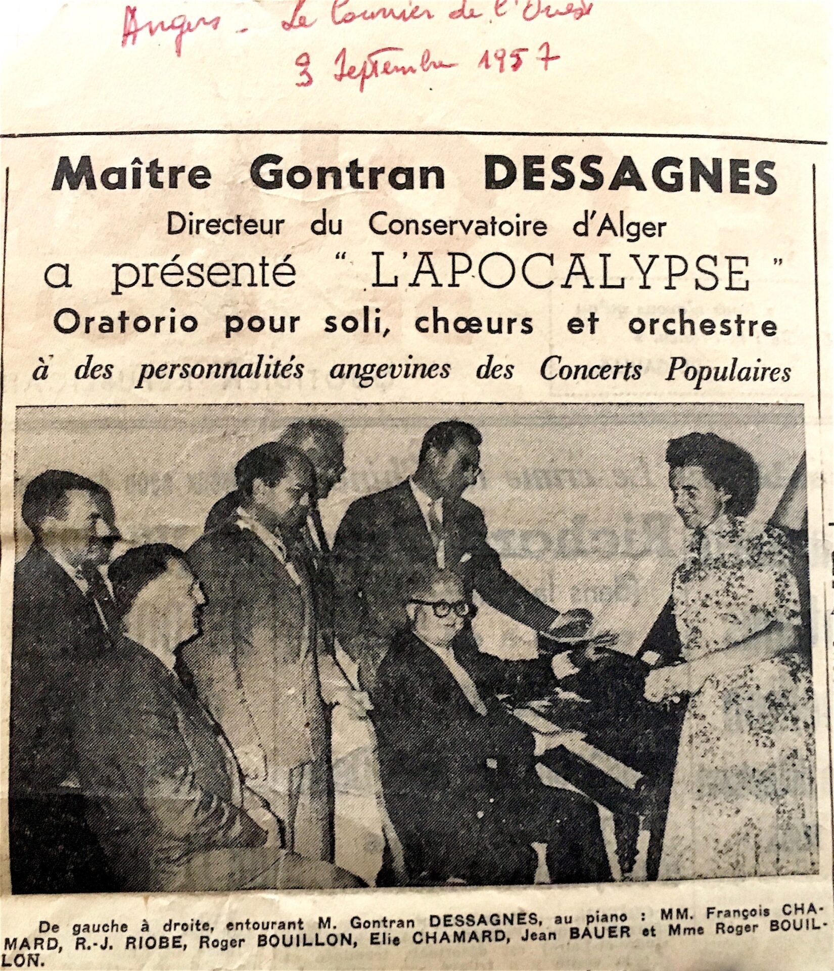 Professeur de piano à la Société des Beaux-Arts, des Sciences et des Lettres d’Alger (1930-1946), Gontran Dessagnes se produira lors de nombreux concerts comme pianiste virtuose et à la direction d’orchestre, présentera une série de conférences de culture musicale dans les principales villes d’Algérie et au Maroc, exercera comme critique musical dans le journal Liberté.
